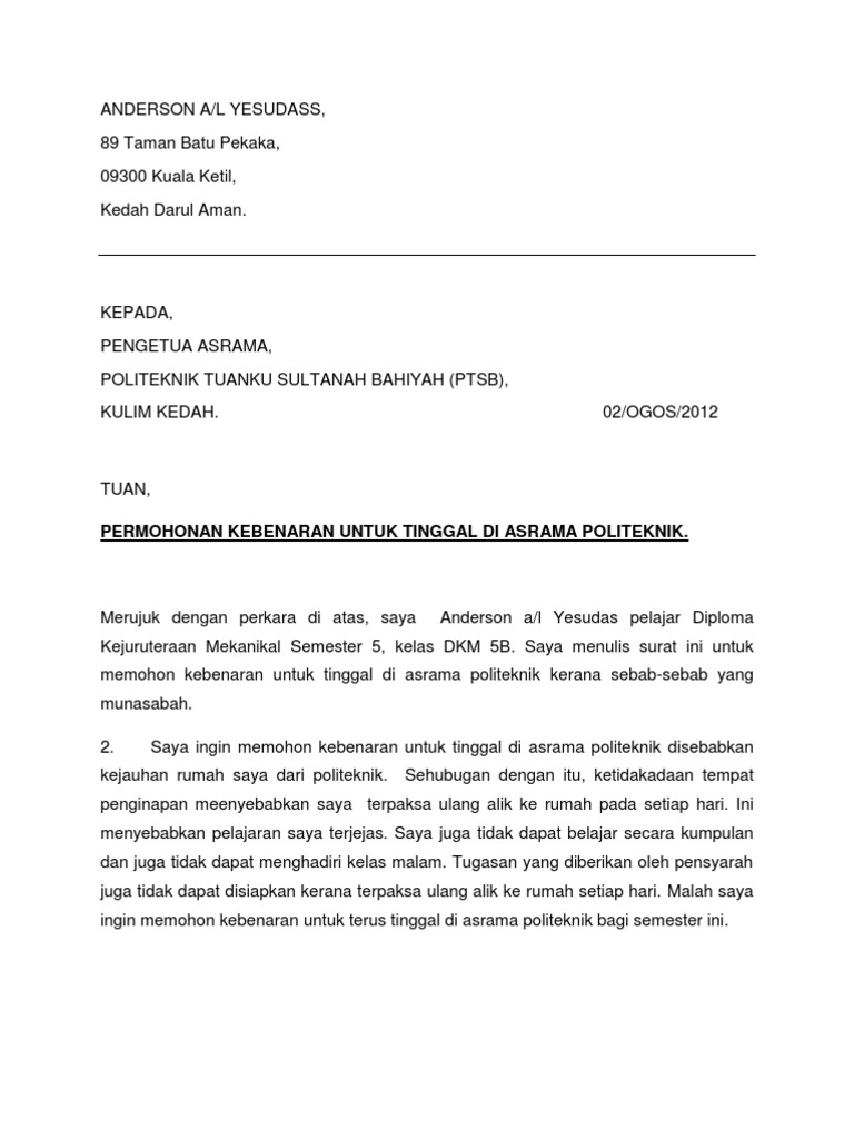 Surat Kiriman Rasmi Permohonan Untuk Tinggal Di Asrama Sekolah Pdf